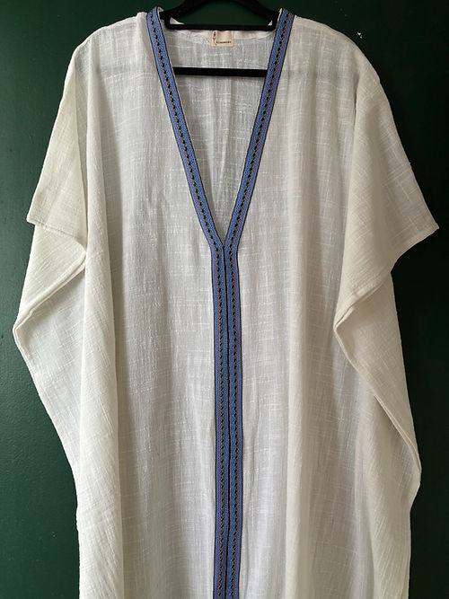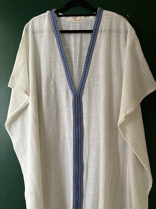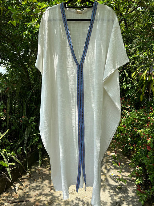 Kaftan longo em gaze de algodão branco com fendas laterais e passamanaria azul