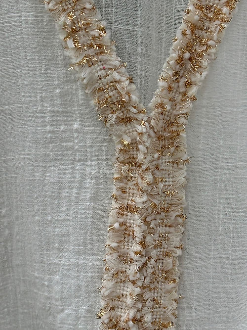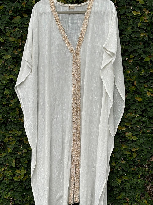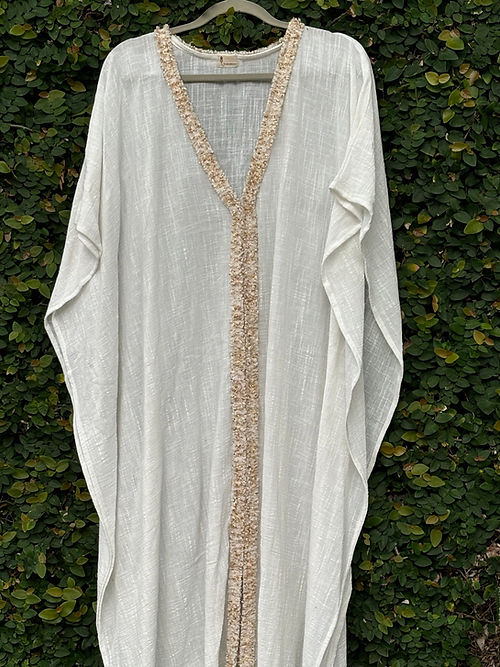 Kaftan longo em gaze de algodão branco com fendas laterais e passamanaria de detalhe branco