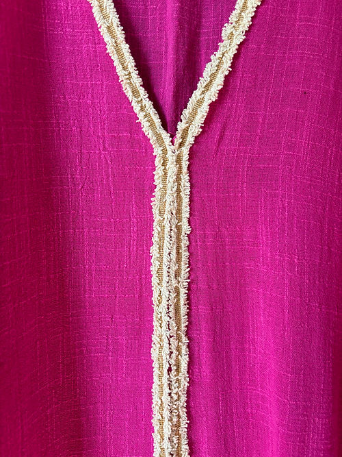 Kaftan longo em gaze de algodão pink com fendas laterais e passamanaria de detalhe branco