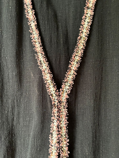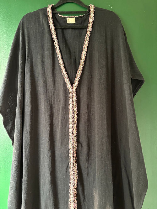 Kaftan longo em algodão preto com fendas laterais e passamanaria de detalhe