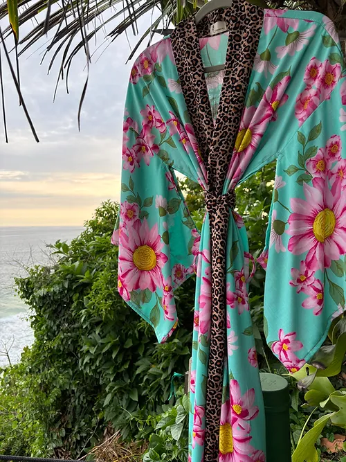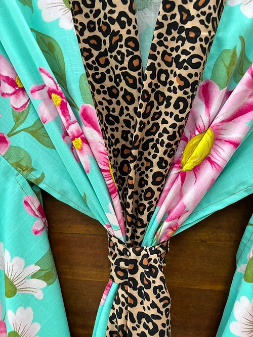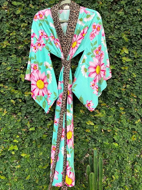 Kimono longo floral turquesa