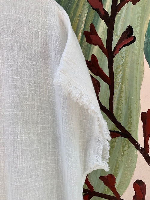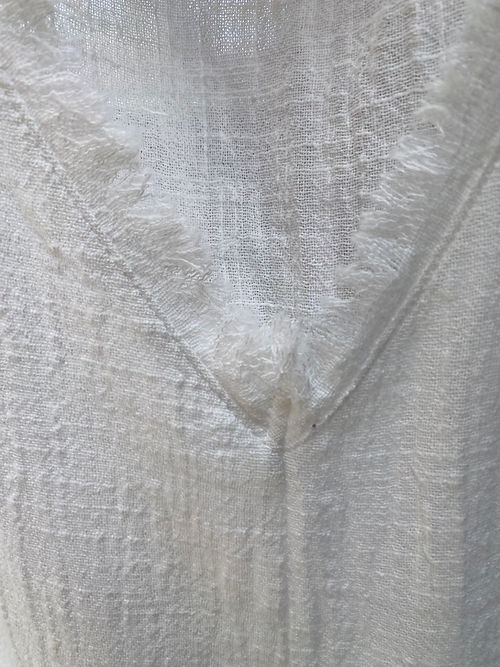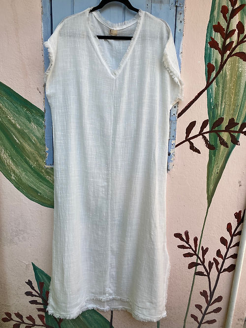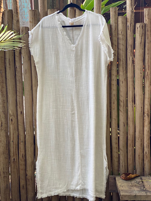 Vestido amplo em gaze de algodão com desfiado na gola e barra