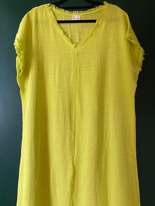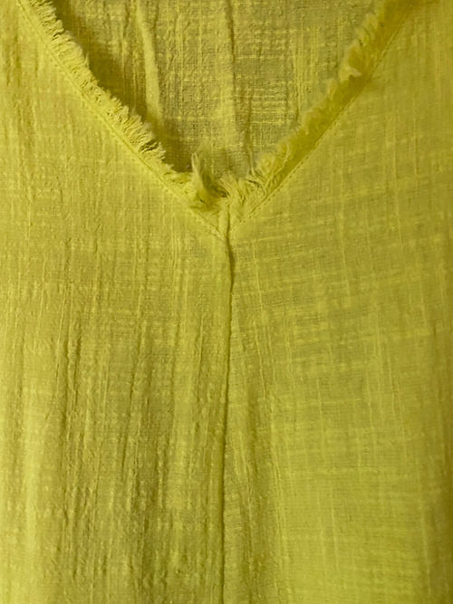 Vestido amplo em gaze de algodão com desfiado na gola e barra